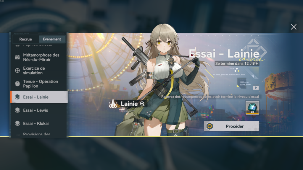 Des stages de test permettent également d’essayer Lainie, Lewis et Klukai, tout en récupérant des ressources supplémentaires. En parallèle, des récompenses de connexion offrent des permis d’accès libre pour la bannière permanente.